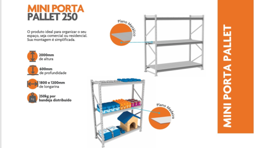 Prático e versátil, além de ser de fácil montagem. Dispensa o uso de empilhadeiras, onde as mercadorias são depositadas e retiradas manualmente dos planos, que podem ser com bandejas de aço ou madeira. Produzido em aço resistente, com capacidade de 250kg por nível e reforço nas laterais é indicado para depósitos, estoques e exposição, como: pet shops, oficinas, lojas de materiais de construção e mini atacarejos.