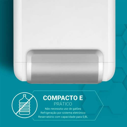 - Sistema de refrigeração eletrônico e design funcional: A refrigeração é feita por sistema eletrônico, oferecendo água gelada entre 6°C e 12°C, dependendo da temperatura ambiente, com capacidade de refrigeração de 0,600 L/h. O equipamento conta com bandeja coletora removível e dreno de água, facilitando a limpeza e manutenção. Sua torneira única possibilita fácil acionamento, enquanto o formato compacto permite instalação em diferentes espaços.