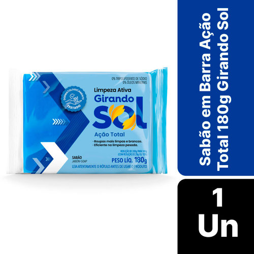 - Eficiência e cuidado em cada lavagem: O Sabão em Barra Girando Sol Ação Total 180g foi desenvolvido para garantir uma limpeza profunda com alto desempenho e respeito ao meio ambiente. Sua fórmula biodegradável permite que o produto se decomponha naturalmente, sem causar impactos negativos à natureza. Além disso, é dermatologicamente testado, o que assegura segurança no uso diário, tanto em roupas quanto em utensílios domésticos.