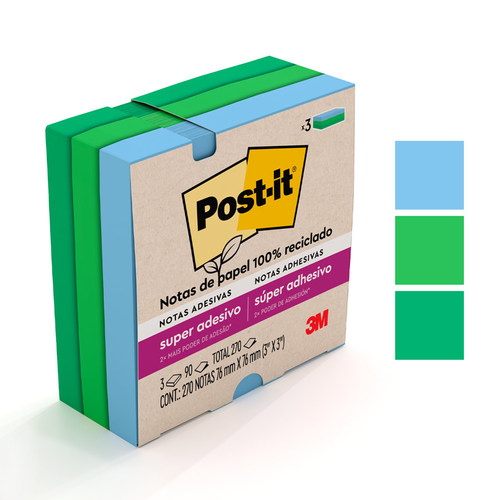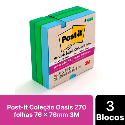 - Organização prática e sustentável para o dia a dia: O Post-it Coleção Oasis 76 x 76 mm 3M é a solução ideal para anotações rápidas, lembretes e organização de tarefas em ambientes pessoais ou profissionais. Com 270 folhas distribuídas em três blocos coloridos nas cores azul, verde claro e verde escuro, proporciona visual moderno e dinâmico, facilitando a categorização de informações e o destaque de recados importantes.