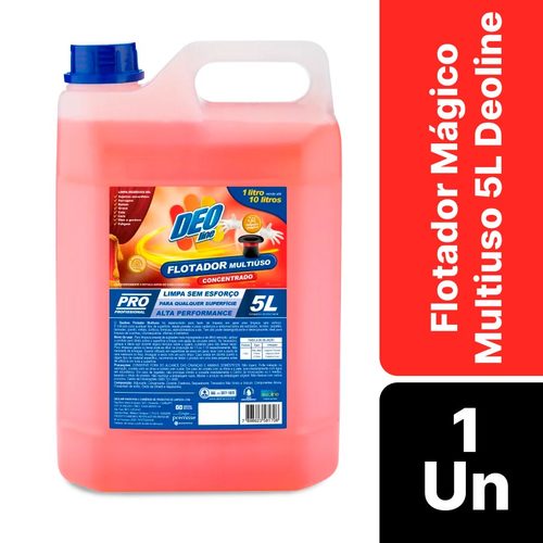 - Limpador Flotador Mágico Multiuso 5L Deoline, desempenho profissional para limpeza pesada e geral: O Flotador Mágico Multiuso Deoline foi desenvolvido para oferecer alta performance em limpezas domésticas e profissionais. Sua fórmula concentrada utiliza tecnologia de flotação, permitindo que a sujeira se desprenda com facilidade de superfícies como pisos, paredes, revestimentos, equipamentos, eletrodomésticos, fórmicas e áreas encardidas, garantindo resultados rápidos e eficientes com menor esforço.