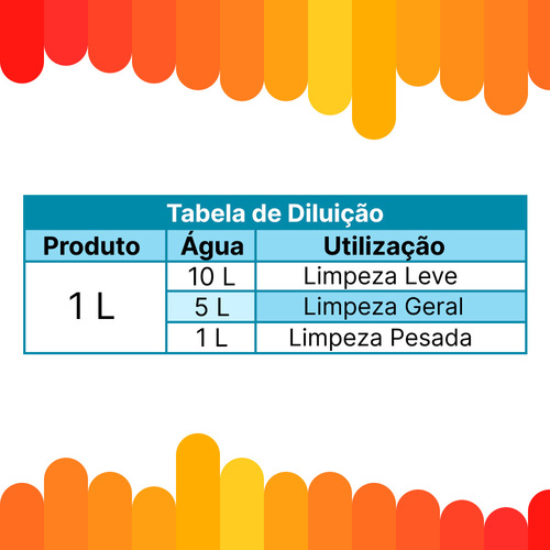 - Facilidade de uso com rendimento elevado: Pode ser usado puro para limpeza pesada ou diluído em proporções de 1:5 até 110 para limpezas gerais e leves, alcançando ótimo rendimento, cada litro rende até 10 litros. Não requer enxágue na maioria das superfícies, o que agiliza o processo de higienização. Para pisos, recomenda-se esfregar e enxaguar para acabamento perfeito.