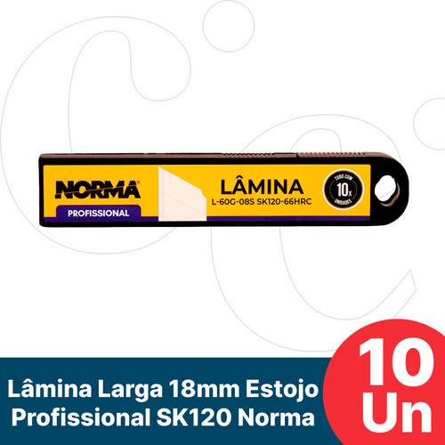 - Lâmina larga profissional 18 mm para cortes pesados e precisos: A Lâmina Profissional Norma SK120 18 mm foi desenvolvida para aplicações que exigem alto desempenho, resistência e precisão. Fabricada no Japão em aço carbono JIS G 4401:2009-SK120 (SK2), apresenta elevada durabilidade e excelente retenção de fio, sendo indicada para uso profissional e industrial.
