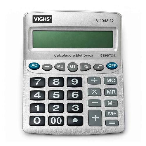 - Calculadora de mesa 12 dígitos com visor inclinado, teclas grandes e função GT: A Calculadora de Mesa V-1048-12 da Vighs foi desenvolvida para proporcionar eficiência e precisão em cálculos do dia a dia. Com visor inclinado de 12 dígitos, oferece leitura clara e confortável das operações, sendo indicada para uso em escritórios, comércios, ambientes administrativos e rotinas financeiras.