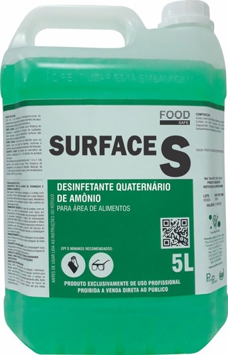 SURFACE S é um detergente à base de quaternário de amônio indicado para desinfecção, desodorização e controle bacteriostático. Deve ser diluído conforme a finalidade: 1:10 para desinfecção e 1:100 para controle de odores e bactérias.