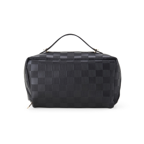 Nécessaire com zíper e couro sintético. Possui abertura larga, 3 bolsos, 3 compartimentos para organização dos itens, alça superior e área de personalização em couro sintético.