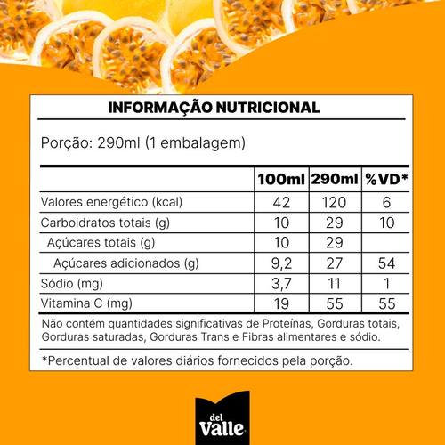 - Néctar de fruta com sabor intenso e perfil equilibrado: O Suco Del Valle Néctar Maracujá 290ml é elaborado com até 50% de suco ou polpa de fruta, conforme a categoria de néctares, oferecendo um sabor marcante e característico do maracujá. Sua formulação entrega equilíbrio entre acidez natural e refrescância, resultando em uma bebida agradável e adequada para consumo diário.