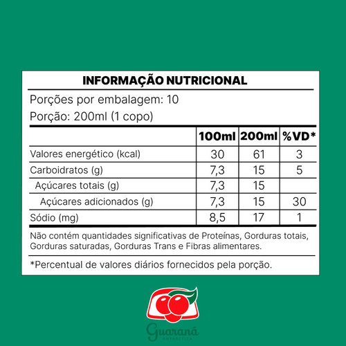 - Ingredientes: Água gaseificada, açúcar, extrato de guaraná, aromatizante, acidulante ácido cítrico, conservadores: benzoato de sódio e sorbato de potássio e corante caramelo IV.