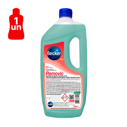 - Detergente Desincrustante Ácido Removic 750ml PA5491 Becker: O Detergente Desincrustante Removic é um produto ácido perfumado desenvolvido para remoção eficiente de manchas, incrustações minerais e resíduos de cimento. Indicado para limpeza de vasos sanitários, rejuntes e superfícies como porcelanato, granito e cerâmicas vitrificadas, promove ação química de alta performance. Possui em sua formulação matéria-prima biodegradável, contribuindo para melhor compatibilidade ambiental.